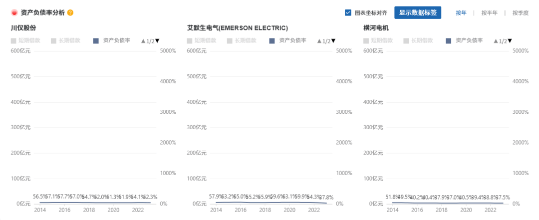 2023年,川仪股份的资产欠债率为52。3%,远高于艾默生电气的37。8%和恒河电器的37。5%。